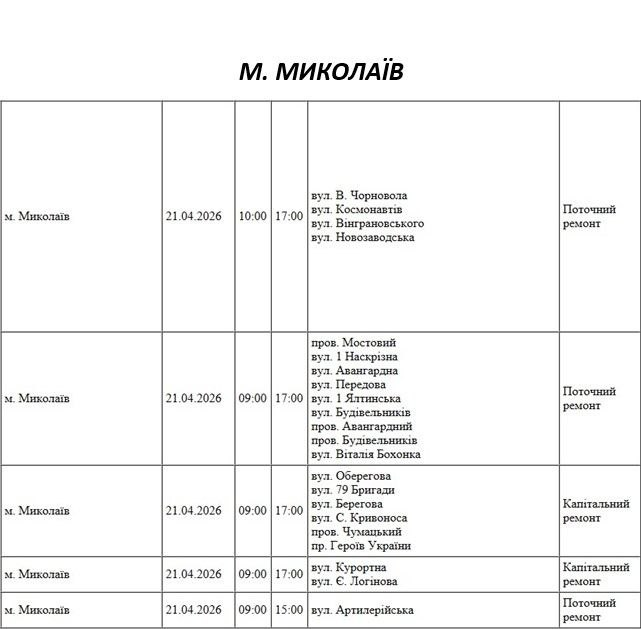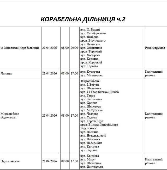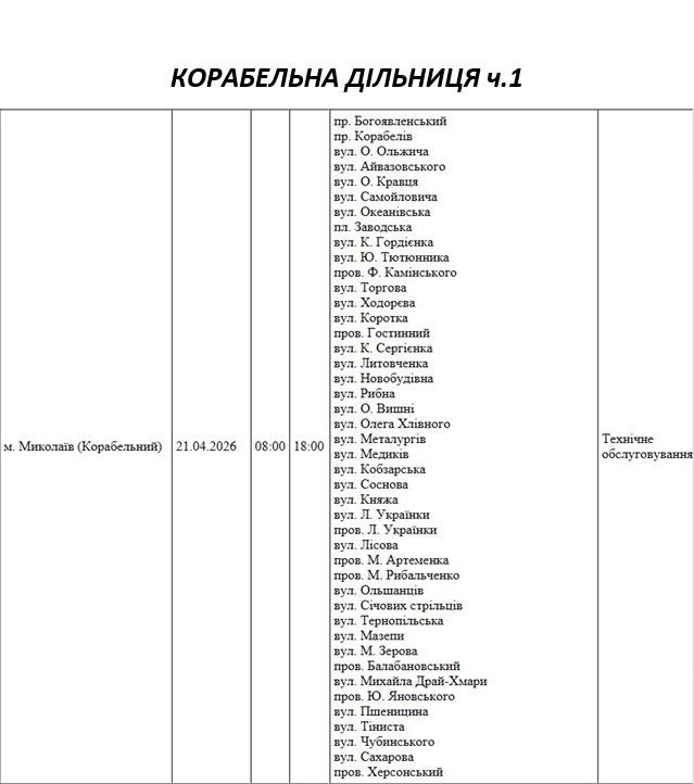 Графік відключення світла по адресах 21 квітня, Корабельна дільниця. АТ «Миколаївобленерго»