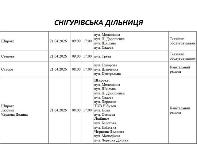 Графік відключення світла по адресах 21 квітня, Снігурівська дільниця. АТ «Миколаївобленерго»
