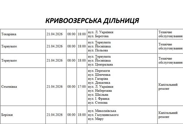 Графік відключення світла по адресах 21 квітня, Кривоозерська дільниця. АТ «Миколаївобленерго»