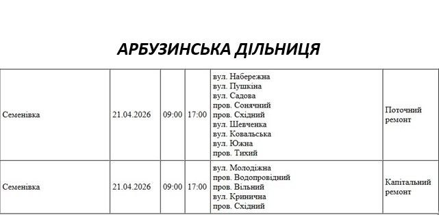 Графік відключення світла по адресах 21 квітня, Арбузинська дільниця. АТ «Миколаївобленерго»