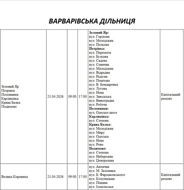 Графік відключення світла по адресах 21 квітня, Варварівська дільниця. АТ «Миколаївобленерго»