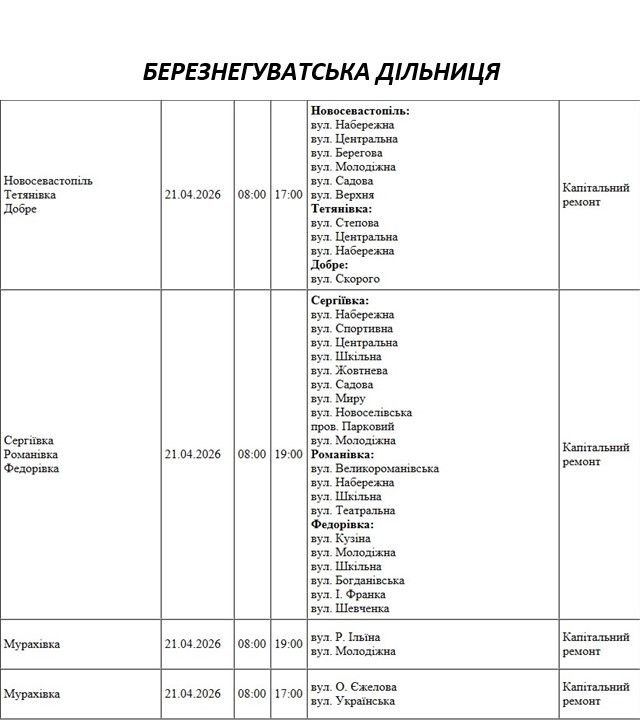 Графік відключення світла по адресах 21 квітня, Березнегуватська дільниця. АТ «Миколаївобленерго»