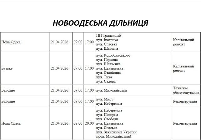 Графік відключення світла по адресах 21 квітня, Новоодеська дільниця. АТ «Миколаївобленерго»