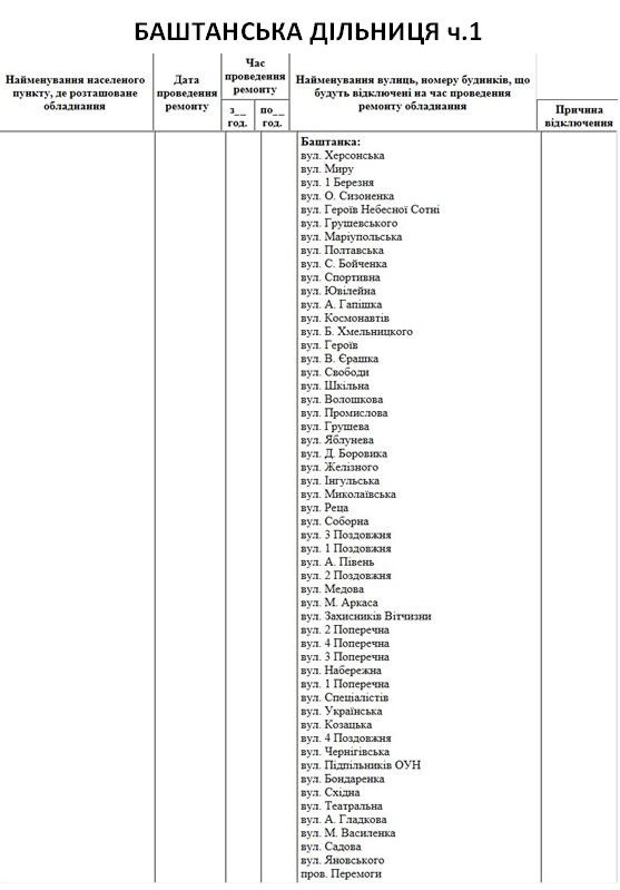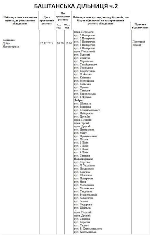 Графік відключення світла по адресах 22 грудня, Баштанська дільниця. АТ «Миколаївобленерго»
