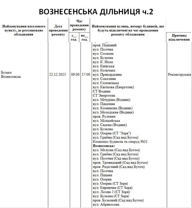 Графік відключення світла по адресах 22 грудня, Вознесенська дільниця. АТ «Миколаївобленерго»
