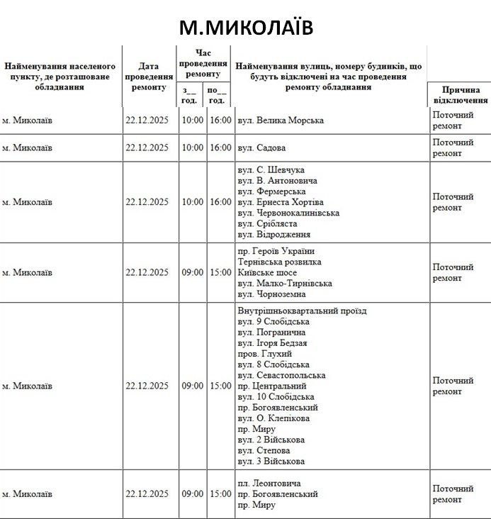Графік відключення світла по адресах 22 грудня, Миколаїв. АТ «Миколаївобленерго»