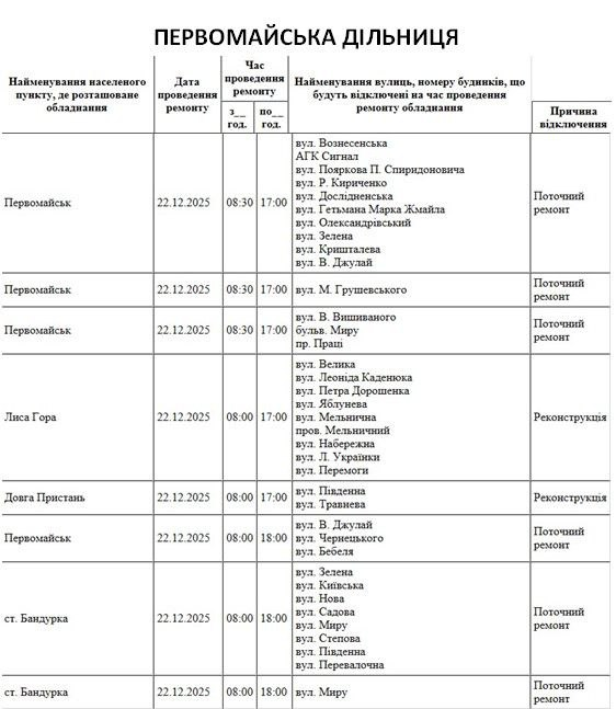 Графік відключення світла по адресах 22 грудня, Первомайська дільниця. АТ «Миколаївобленерго»