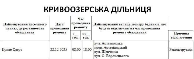Графік відключення світла по адресах 22 грудня, Кривоозерська дільниця. АТ «Миколаївобленерго»