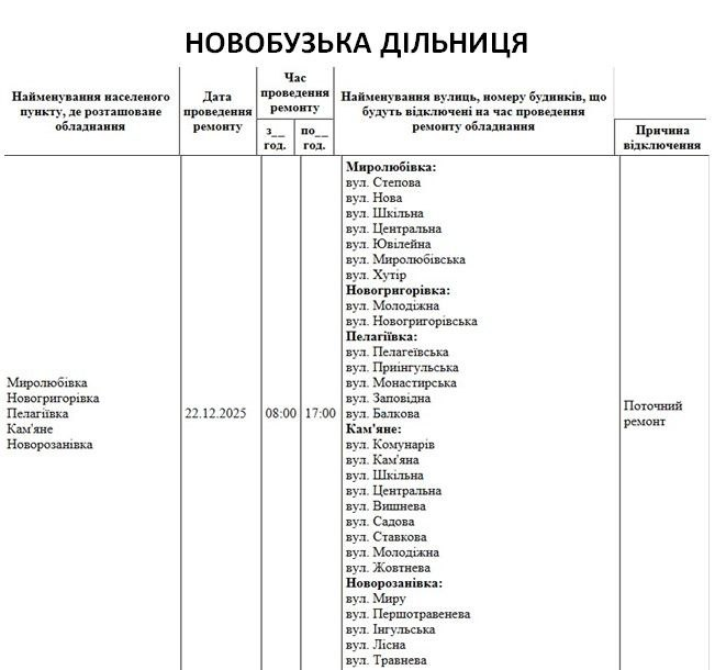 Графік відключення світла по адресах 22 грудня, Новобузька дільниця. АТ «Миколаївобленерго»