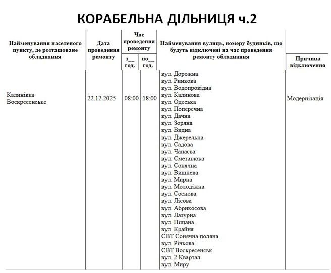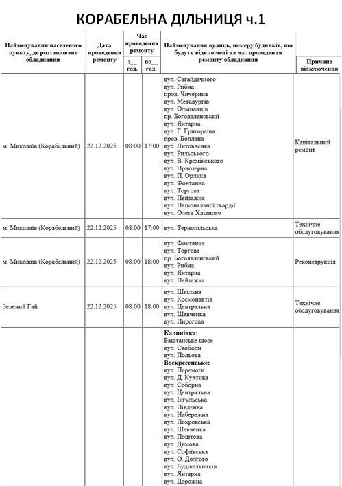 Графік відключення світла по адресах 22 грудня, Корабельна дільниця. АТ «Миколаївобленерго»