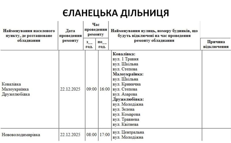 Графік відключення світла по адресах 22 грудня, Єланецька дільниця. АТ «Миколаївобленерго»