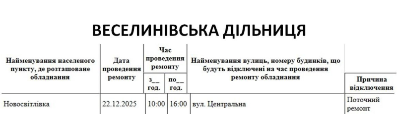 Графік відключення світла по адресах 22 грудня, Веселинівська дільниця. АТ «Миколаївобленерго»