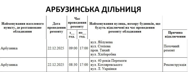 Графік відключення світла по адресах 22 грудня, Арбузинська дільниця. АТ «Миколаївобленерго»