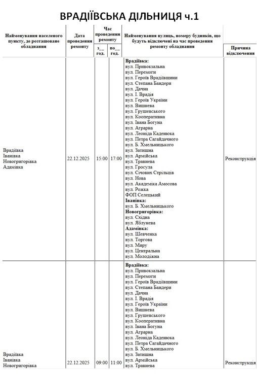 Графік відключення світла по адресах 22 грудня, Врадіївська дільниця. АТ «Миколаївобленерго»