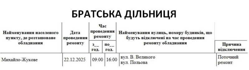 Графік відключення світла по адресах 22 грудня, Братська дільниця. АТ «Миколаївобленерго»