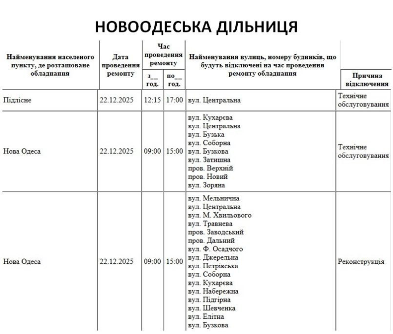 Графік відключення світла по адресах 22 грудня, Новоодеська дільниця. АТ «Миколаївобленерго»