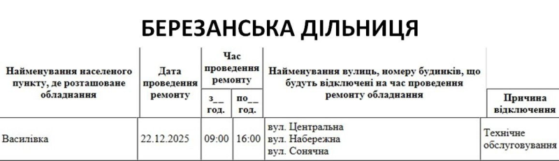 Графік відключення світла по адресах 22 грудня, Березанська дільниця. АТ «Миколаївобленерго»