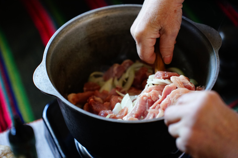 Наталя підготувала нарізану свинину та овочі. Це зажарка для плову, яку господиня спочатку приготує в казані.