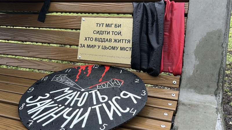 Лавочка із табличкою про військовополонених та безвісти зниклих. Суспільне Миколаїв/Роман Волинський