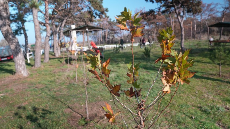 "Тут висаджуємо максимальну кількість дерев, які ми підібрали для даної території. Це такі дерева, як декілька видів кленів — клен цукровий, клен явір, клен гостролистий, платан, мильне дерево, катальпа, дуб червоний, дуб звичайний, сосна кримська, магонія падуболиста", — говорить Завгородній.