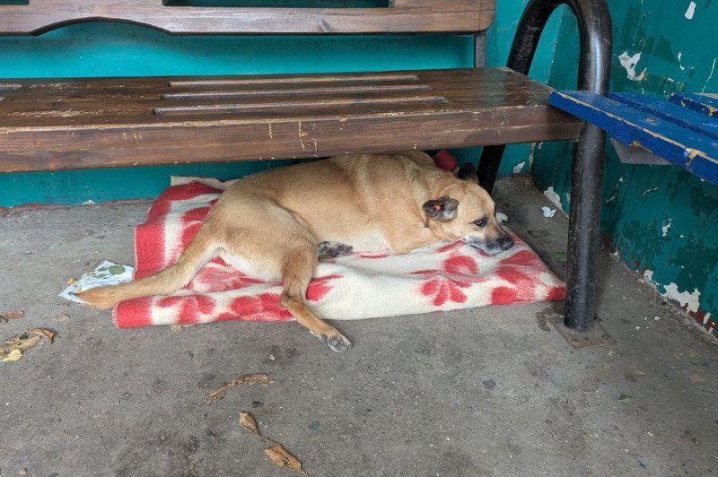 Собака лежить на ковдрі. Південноукраїнська міська рада