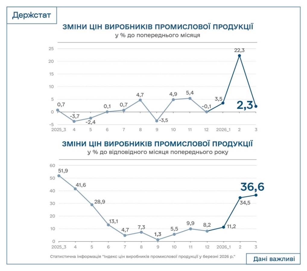 В Україні у березні 2026 року ціни виробників промислової продукції зросли на 2,3% до попереднього місяця. У річному вимірі індекс цін виробників становив 36,6%.