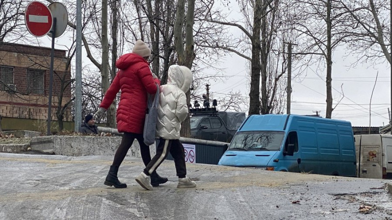 Люди йдуть по дорозі, вкритій кригою у Миколаєві . Суспільне Миколаїв/Аліна Ковальчук