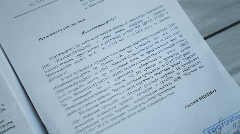 За словами Логвінова, ТОВ "Ніконджитбудсервіс" надіслало листи про те, що будинку не потрібні послуги з теплопостачання, і що жодних договорів із "Миколаївоблтеплоенерго" вони не укладали.