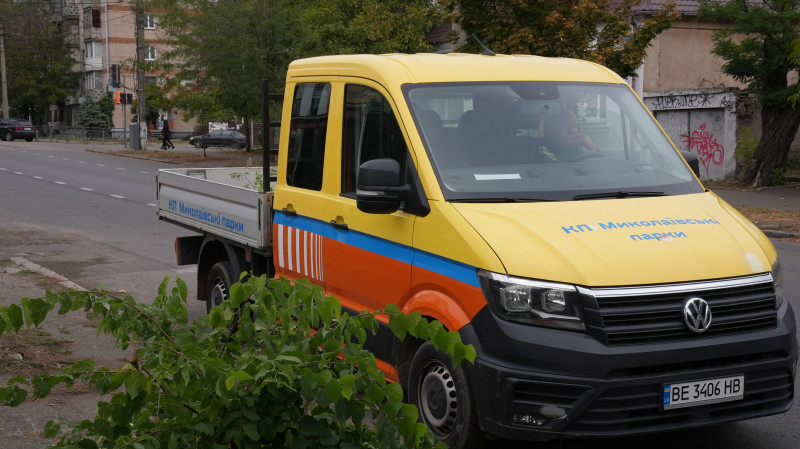 Комунальна автівка, у яку складають опале листя та гілки Юлія Голокоз/Суспільне Миколаїв