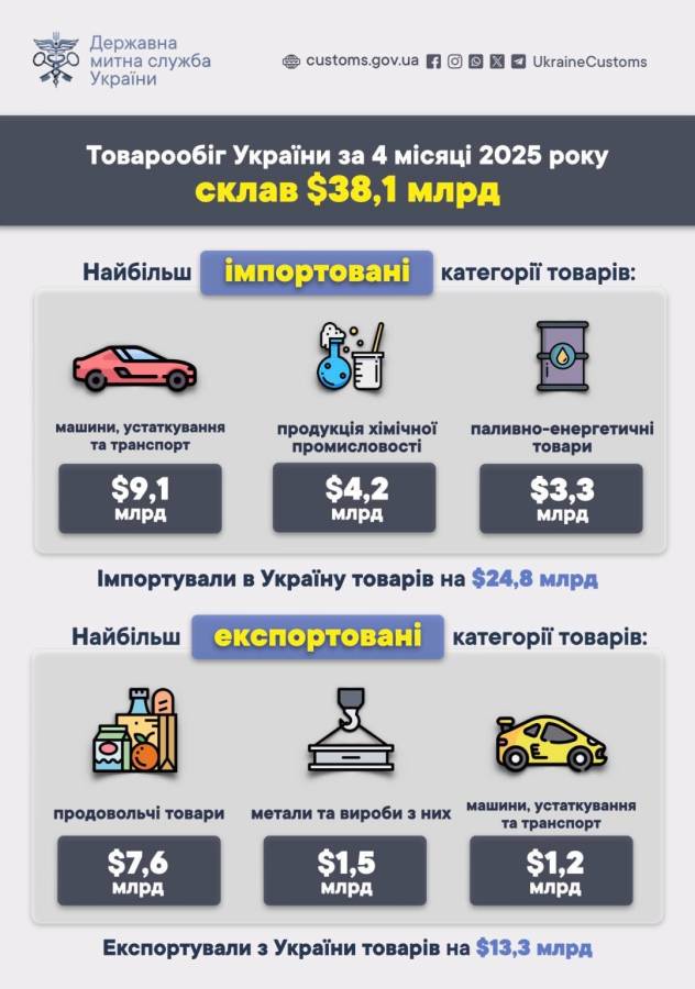 Зазначається, що за перші чотири місяці 2025 року Україна імпортувала товарів на 24,8 млрд дол. США, а експортувала товарів на 13,3 млрд дол. США.