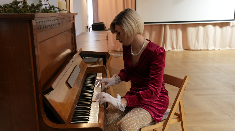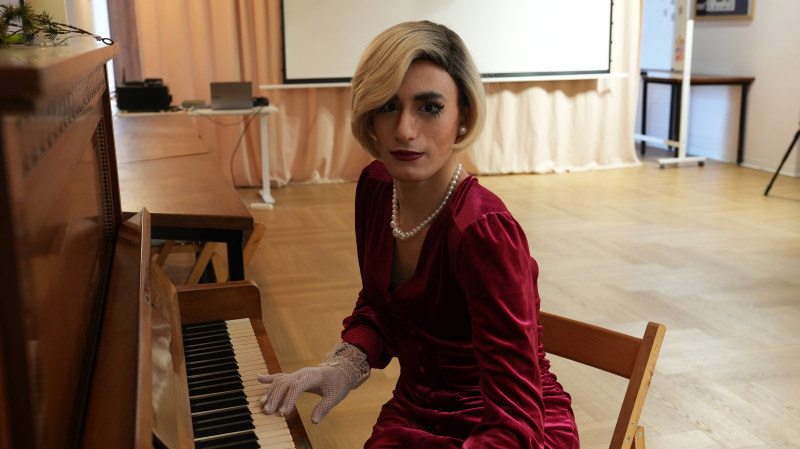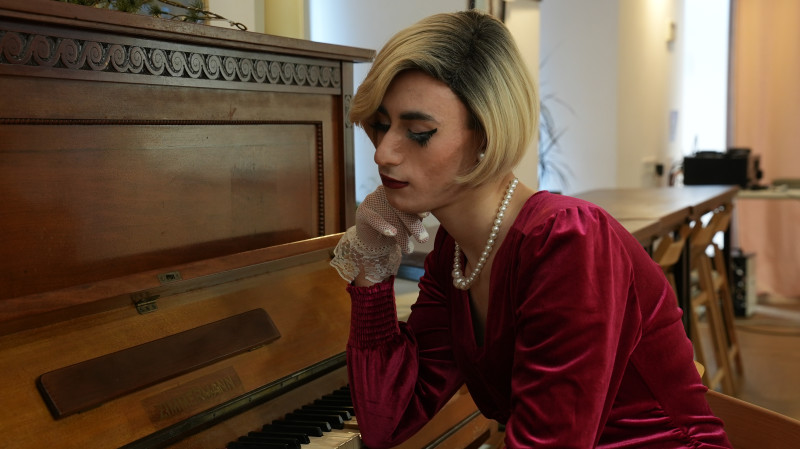 Ігор в образі «Моллі Ді» грає на фортепіано Маріетта Мкртчян