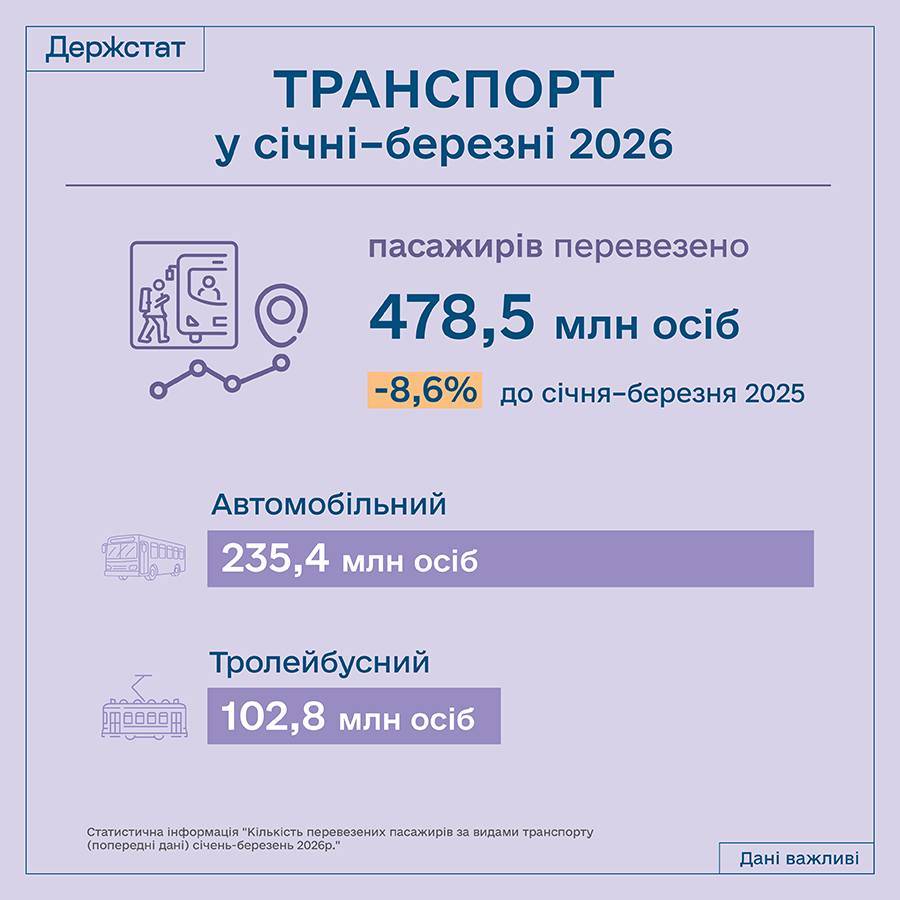 «За січень – березень 2026 року пасажирським транспортом скористалося 478,5 млн осіб. Це -8,6% відносно січня – березня 2025 року», — йдеться в повідомленні.