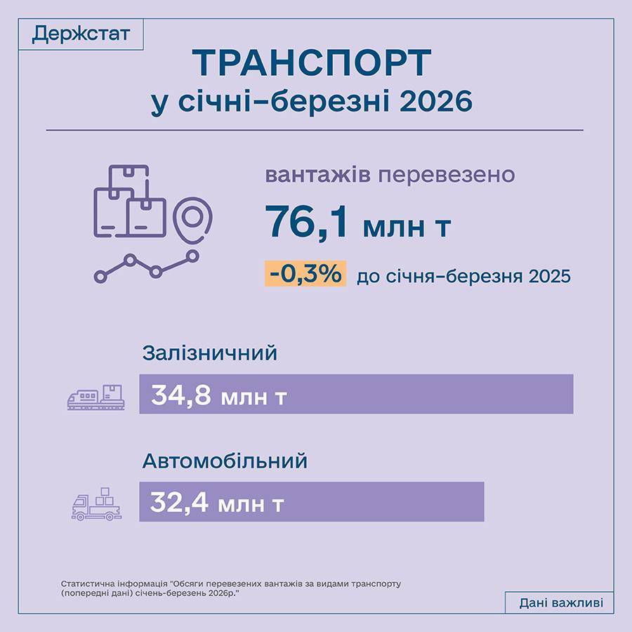 У І кварталі 2026 року Україною було перевезено на 8,6% менше пасажирів і на 0,3% — вантажів у порівнянні з аналогічним періодом 2025 року.