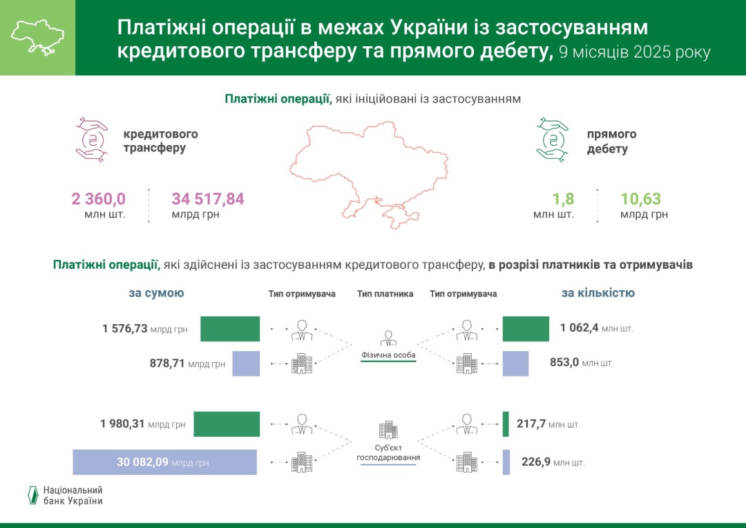 Зазначається, що в Україні послуги з виконання платіжних операцій із застосуванням кредитового трансферу та прямого дебету надавали усі 60 банків та дві небанківські фінансові установи. За дев'ять місяців 2025 року вони здійснили 1,8 млн платіжних операцій на суму 10,63 млрд грн із застосуванням прямого дебету.