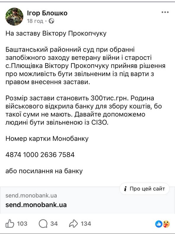 Дружина підозрюваного відкрила збір грошей на заставу Віктору Прокопчуку. Станом на 14:00 19 березня, зібрана сума склала близько 100 тисяч гривень з 300 необхідних.