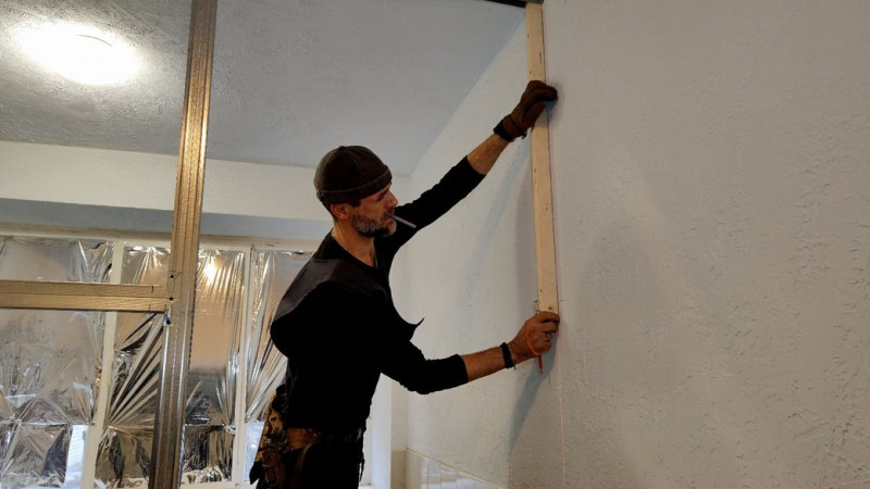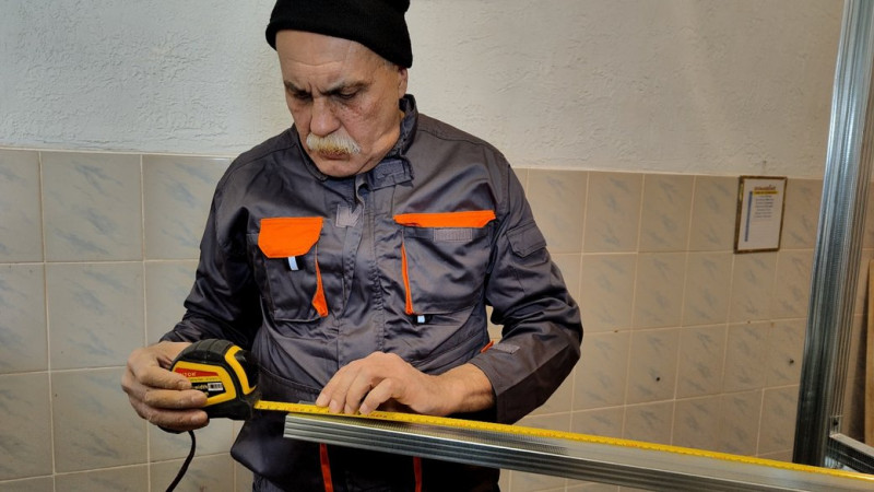 Ветеран робить заміри металевого профілю перед монтажем конструкції. Суспільне Миколаїв/Федір Бондар