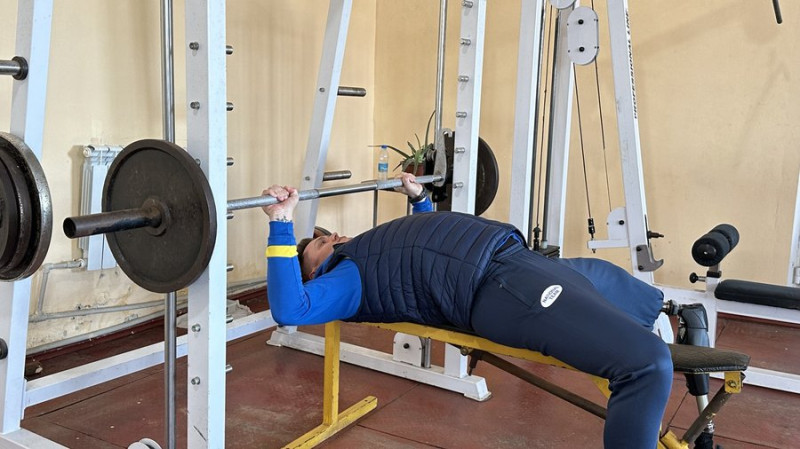 Чоловік у тренажерній залі виконує жим штанги лежачи на лаві. Суспільне Миколаїв/Назарій Рубаняк