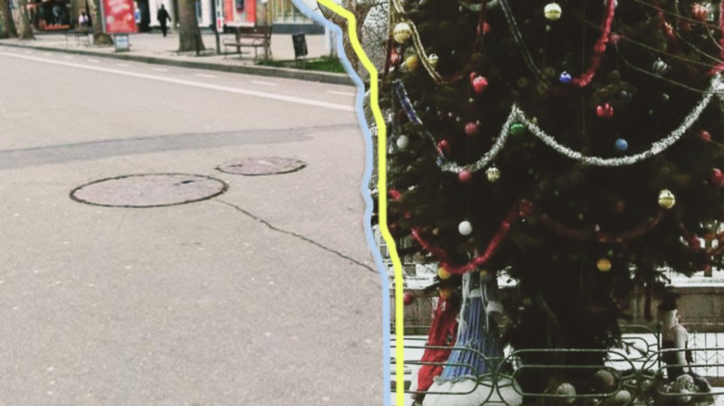 Зліва на фото сучасний вигляд місця, де встановлювали ялинку. Справа – ялинка, встановлена на вулиці Соборній на початку 2000 років. Фото: Николаевский БазарЪ