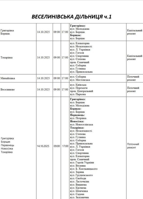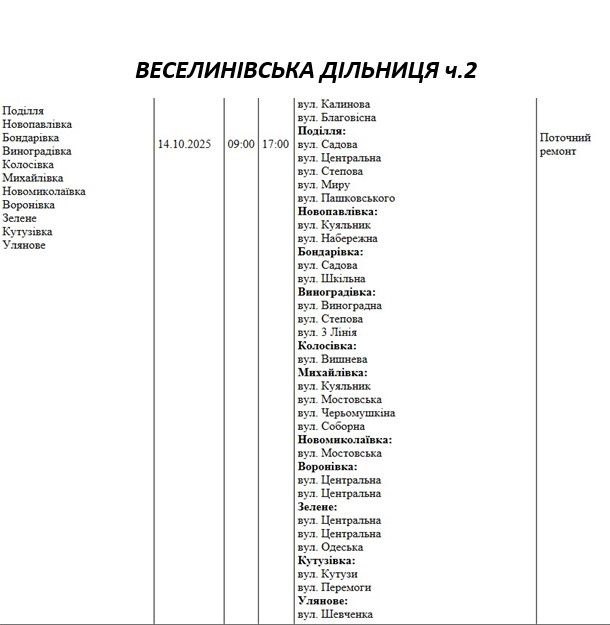 Графік відключення світла по адресах 14 жовтня, Веселинівська дільниця АТ «Миколаївобленерго»