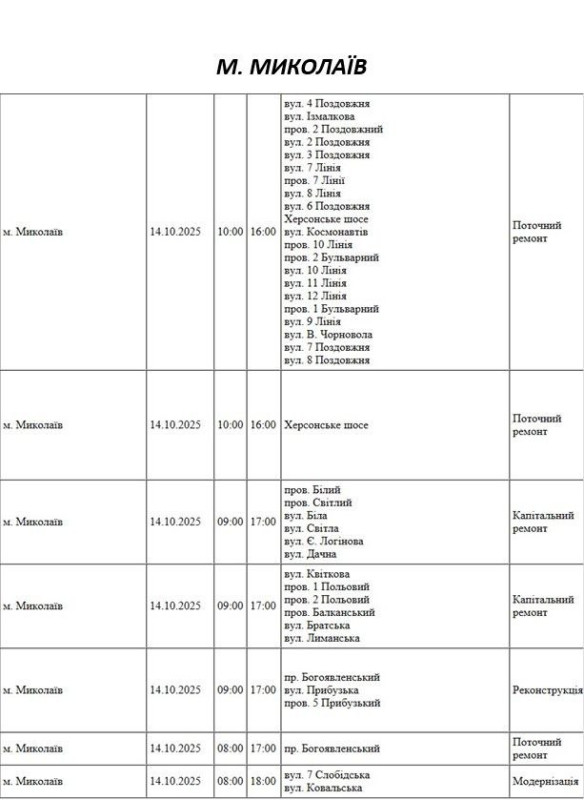 Графік відключення світла по адресах 14 жовтня, Миколаїв АТ «Миколаївобленерго»