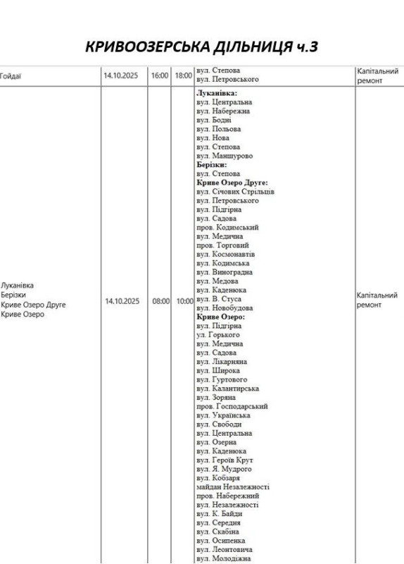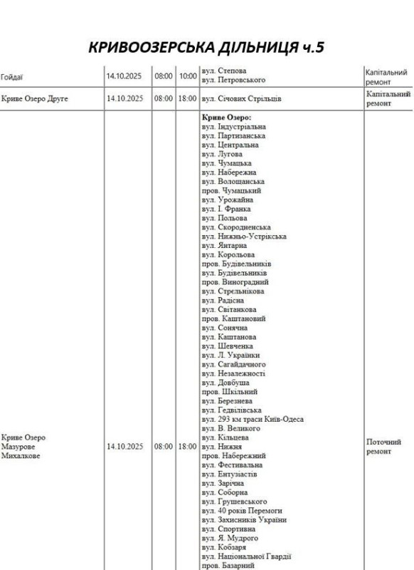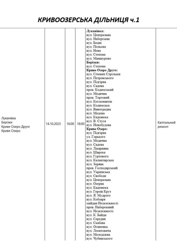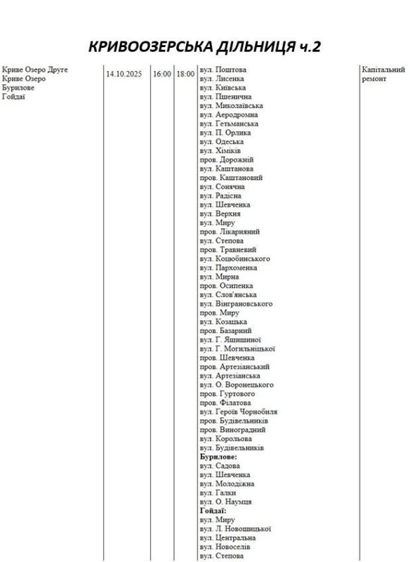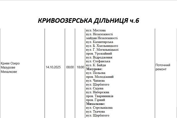 Графік відключення світла по адресах 14 жовтня, Кривоозерська дільниця АТ «Миколаївобленерго»