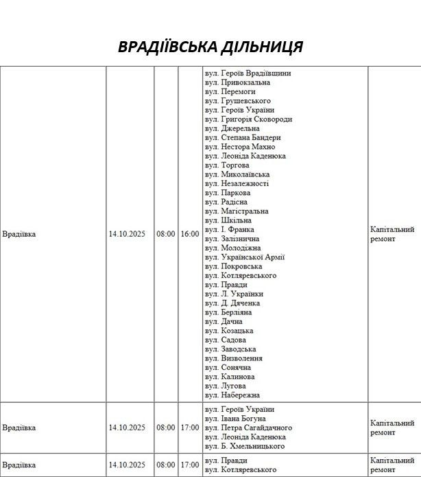 Графік відключення світла по адресах 14 жовтня, Врадіївська дільниця АТ «Миколаївобленерго»