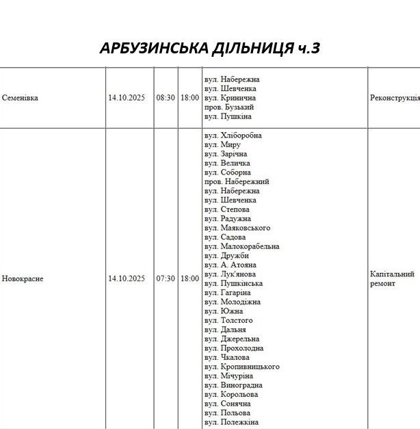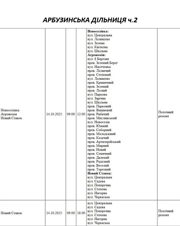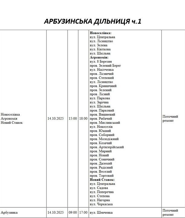 Графік відключення світла по адресах 14 жовтня, Арбузинська дільниця АТ «Миколаївобленерго»