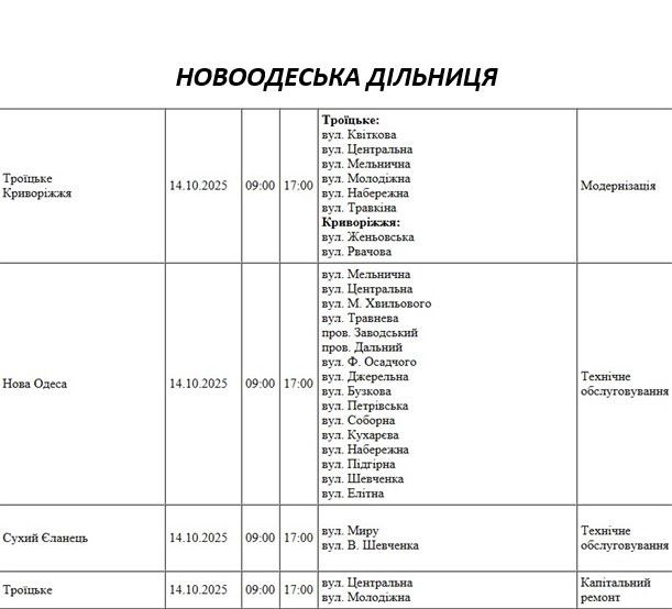 Графік відключення світла по адресах 14 жовтня, Новоодеська дільниця АТ «Миколаївобленерго»