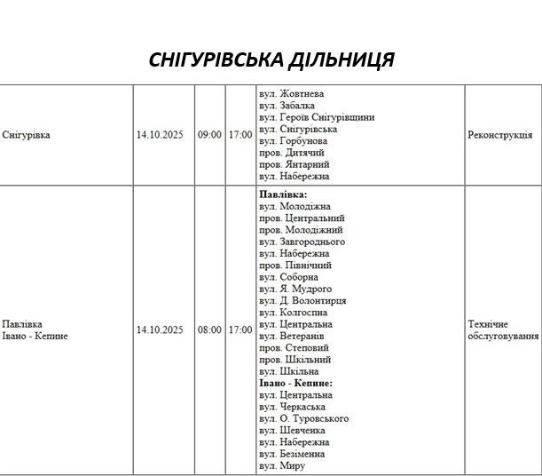 Графік відключення світла по адресах 14 жовтня, Снігурівська дільниця АТ «Миколаївобленерго»