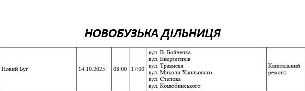 Графік відключення світла по адресах 14 жовтня, Новобузька дільниця АТ «Миколаївобленерго»