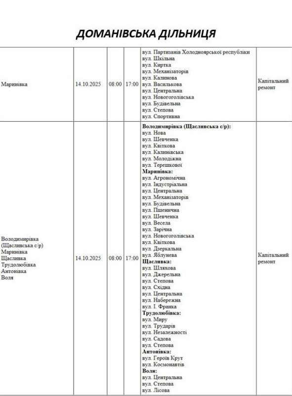 Графік відключення світла по адресах 14 жовтня, Доманівська дільниця АТ «Миколаївобленерго»