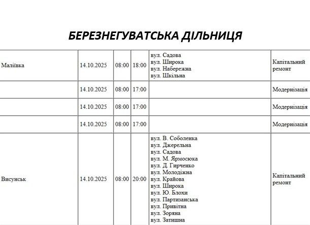 Графік відключення світла по адресах 14 жовтня, Березнегуватська дільниця АТ «Миколаївобленерго»