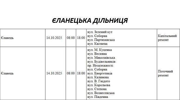 Графік відключення світла по адресах 14 жовтня, Єланецька дільниця АТ «Миколаївобленерго»