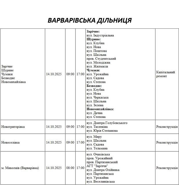 Графік відключення світла по адресах 14 жовтня, Варварівська дільниця АТ «Миколаївобленерго»